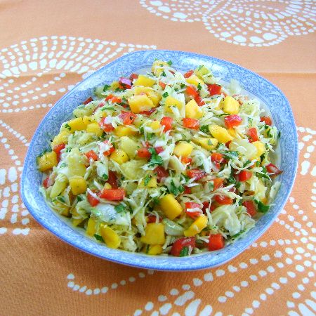 This bright and colorful salad is a wonderful addition to a summer barbecue. It's packed with tropical flavors and its vague sweetness is a perfect foil for the smoky and spicy flavors that come off a grill. The salad is based on one that was served with seafood, particularly shrimp and lobster, when Bob and I were trekking through Baja Mexico, a very long time ago. We were without chick or child at the time and our spirit of adventure was far larger than our wallets. The Baja had not yet been discovered, so it was still possible to explore the peninsula and the Sea of Cortez on the cheap. We camped and cooked on open fires and every so often we'd dine out. My entree on those occasions was always shellfish because it was fresh and abundant and you could watch it being prepared. Were it not for its freshness, that would have been a strange choice. Pacific lobster, at least in my opinion, lacks the flavor of its Atlantic cousin. It needs something to perk it up and slaws or salads of this type really did the trick. I've fashioned a recipe of sorts for you, but as you read through the ingredients you'll see how you might be able to play with it. I love the freshness of this salad and I think you will, too. It's very easy to make and you can be as creative with the ingredients as you like. It is a lovely slaw, but I must admit I miss the dash of adventure we added all those years ago. Perhaps you can add your own. Here's the recipe.