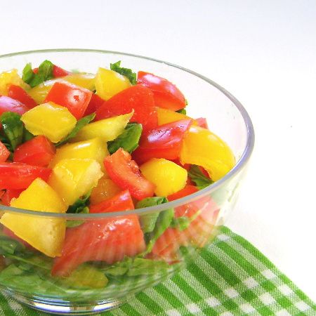 From the kitchen of One Perfect Bite...This is a lovely salad to have on the menu for picnics or barbecues. The play of colors in this dish is spectacular, and its flavors, when made with vine-ripened tomatoes can't be beat. Ideally, it should be made with ripe heirloom tomatoes, but when they are not available, I'm perfectly comfortable substituting other colorful varieties. The salad is one I suspect you'll quickly adapt to your own tastes. The tomatoes can be sliced or diced and the choice of dressing is limited to the cook's imagination. If you were to select one from a bottle, I'd certainly never tell. Homemade or store-bought, my only caution is a reminder to drown the tomatoes in dressing. I like to serve this salad at picnics because it transports easily and jostling in the car won't affect its already rustic appearance. This is the recipe I use to assemble it.