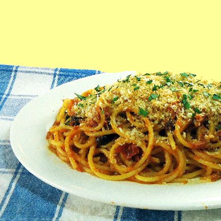 From the kitchen of One Perfect Bite...This is a simple, but classic, Sicilian pasta that has Arabic overtones. The sauce is made with tomatoes, fennel, raisins, sardines and pine nuts. It is usually spooned over a broad or tubular pasta and then topped with a generous sprinkling of toasted breadcrumbs. While I have chosen a simple toss and top application, some cooks prefer to create multiple layers using these ingredients. The breadcrumbs in the dish are used in place of cheese and at one time they actually served that function for the poor. They also have a symbolic importance for those who observe St. Joseph's Day. As you know, Joseph was a carpenter and the breadcrumbs that crown this dish are used because they resemble the sawdust that would be found on the floor of a carpenter's workshop. Pasta con sarde is also known as St. Joseph's pasta, and in those communities where his feast day is still celebrated, you'll find this pasta on family tables, as well as on symbolic altars set up to feed the poor. The dish is easy to make and the sardines give it a unique, though not unpleasant flavor. It, quite simply, tastes of the sea. Raisins are used in Sicilian cooking to provide sweetness and they pair beautifully with the fennel in this recipe. I hope you'll be adventurous and give this earthy peasant dish a try. I really think you'll enjoy it. Here's the recipe.