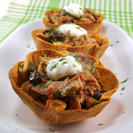 Recipes for picadillo, a Spanish hash, can be found in Mexico, Cuba, the Philippines, Puerto Rico and South America. The version I'm featuring today is an amalgam of recipes from various countries. I first sampled it at a luncheon held at the Institute for Culinary Education in New York City. The luncheon was part of an award ceremony sponsored by Rival, the company that makes the Crock-Pot slow cooker. On that occasion it was served as an appetizer. I served it this past weekend in large muffin-size tortilla cups. It was part of a tapas-type meal that we enjoyed as we watched the Academy Awards. This is an effortless dish that will really delight folks who love crock-pot meals. As nearly as I can determine, the recipe came from BBQ Pit Recipes, a cookbook distributed by the Crock-Pot Brand which, unfortunately, is no longer available. There are no tricks to making this. The chicken goes into the crock and is covered with a chipotle sauce that's made special by the addition of creme fraiche and lime. At the four hour mark, the chicken is removed from the pot and pulled into shreds. It's then returned to the pot to cook for another hour. It can be served over rice or with tortillas. I go the extra mile and make easy tortilla cups for serving. I warm 6-inch flour tortillas in the microwave for 20 seconds and then place them over inverted custard cups. The cups are used to help push the tortillas into Texas-size muffin pans. I bake the cups in a 375 degree F. oven until they are golden brown. I let them cool slightly before removing them from the pans. They can be made ahead of time and stored in air-tight contains or bags. While the cups are for show, the picadillo is delicious. I really hope you'll try this. I promise you won't be sorry. Here's the recipe.