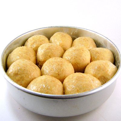 3) Coat a 10-inch round pan with cooking spray. Turn dough out onto a lightly floured work surface. Divide into 12 equal sized pieces. Roll each piece into a ball. Arrange balls in pan. Cover with plastic wrap and let rise at room temperature until almost doubled in size, about 1-1/4 hours.